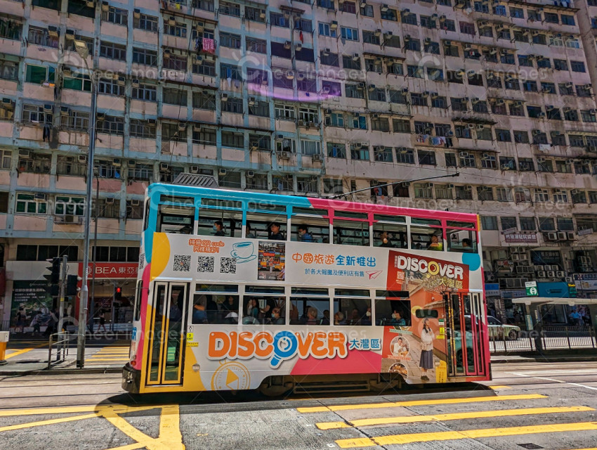 The tram passing the Monster Building. Quarry Bay, Hong Kong, China