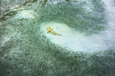 掠食,空拍海中鯊魚和魚群。馬爾代夫