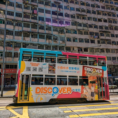 途徑怪獸大廈的電車。中國香港鰂魚涌