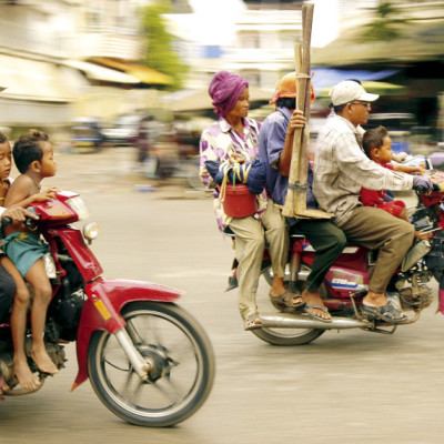 柬埔寨金邊,街頭到處是藝高膽大的摩托車乘客,不時出現多人乘坐一車的驚險鏡頭