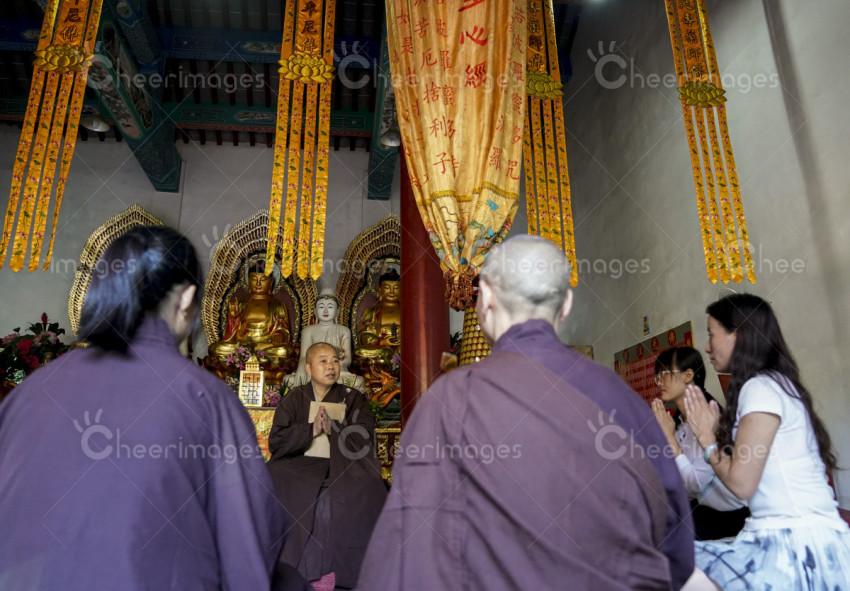 廟宇,聆聽大師講佛法的信眾。湖南長沙金井鎮